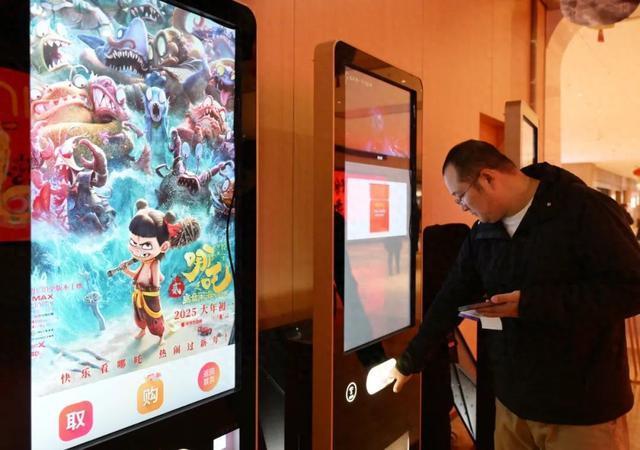 2025年1月29日,一名观众在北京天天中影汇影院大堂的自助取票机上取电影票。新华社记者 李贺 摄